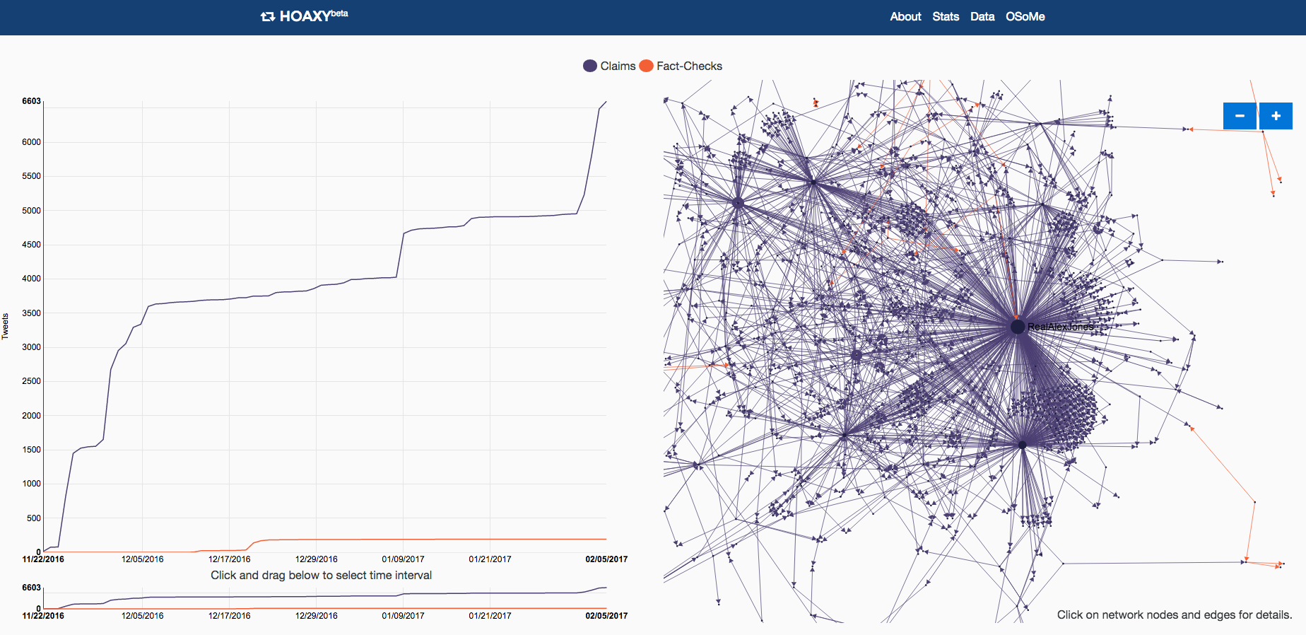 Hoaxy visualizes the spread of claims and related fact checking online. A claim may be a fake news article, hoax, rumor, conspiracy theory, satire, or even an accurate report. Anyone can use Hoaxy to explore how claims spread across social media. You can select any matching fact-checking articles to observe how those spread as well.